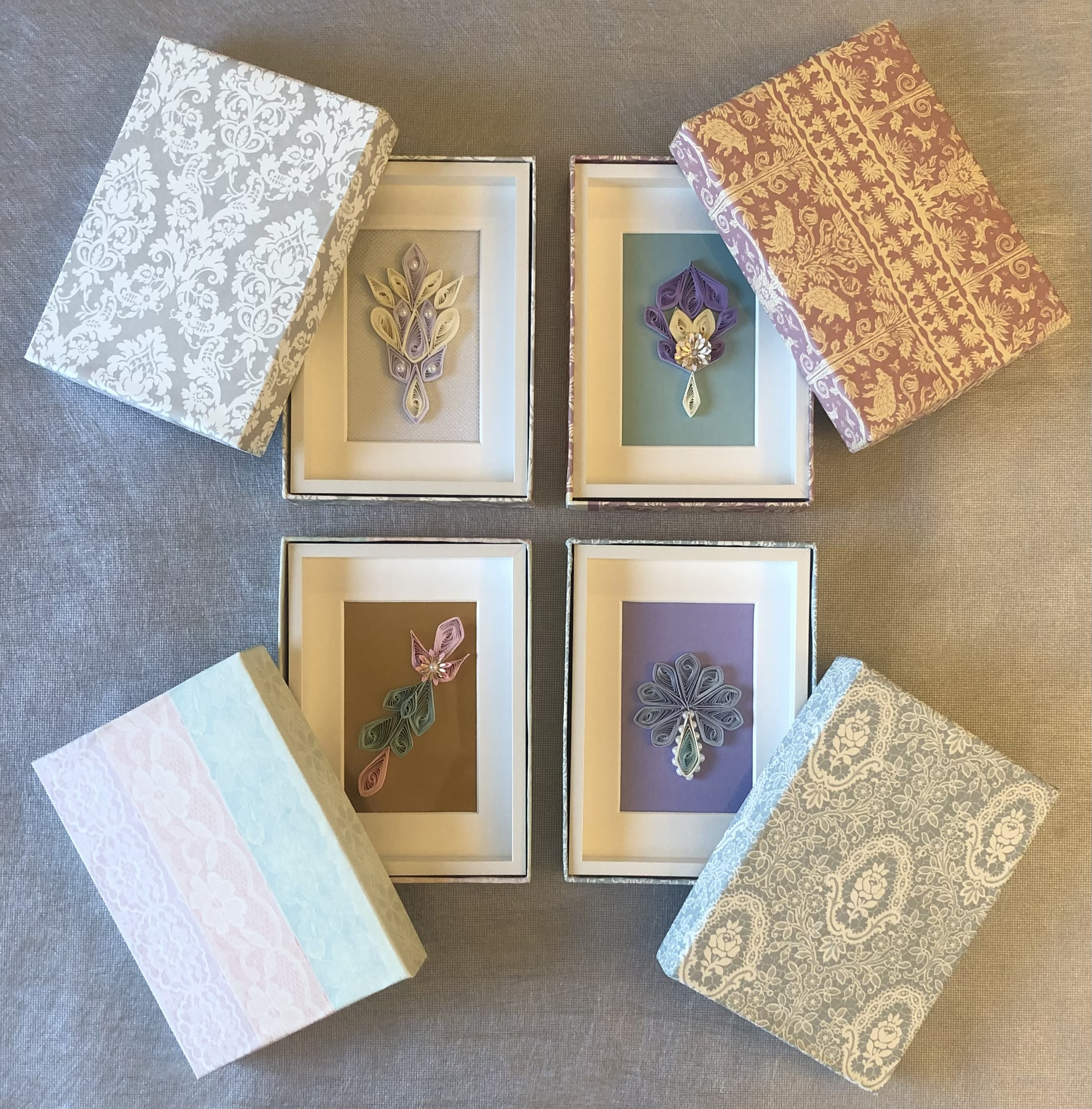 主に紙で構成された作品です。それぞれのデザインに合ったお箱付きで、箱のまま飾っていただく事も出来ます。